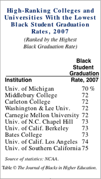 Other high-ranking colleges and universities showing black student graduation rates below 75 percent are Middlebury College, Carleton College, Washington and Lee University, Bates College, UCLA, the University of California at Berkeley, Carnegie Mellon University, and the University of North Carolina at Chapel Hill.