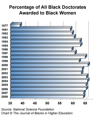 As in almost all measures of African-American achievement in higher education, black women have come to hold a large lead in doctoral awards. As recently as 1977 black women earned only 38.7 percent of all doctorates awarded to African Americans. By 2000 black women earned 65.7 percent of all doctorates awarded to African Americans. There have been only minor fluctuations since the beginning of the century. The latest data from the National Science Foundation shows that in 2008 black women earned 63.9 percent of all doctorates awarded to African Americans.