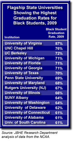 Ten other states have flagship universities that posted an African-American student graduation rate of 61 percent or higher. These are the state universities in Pennsylvania, Delaware, Maryland, New York, Connecticut, South Carolina, Illinois, Washington, Alabama, and New Jersey.