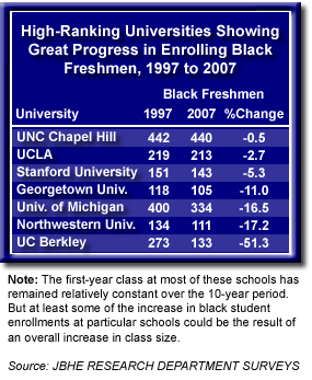 In the 1997 to 2007 period, seven of the nation’s 25 highest-ranked universities showed a decrease in black first-year enrollments. At some of the universities such as Stanford and the University of North Carolina at Chapel Hill, the declines were quite small. Nevertheless, considering that the vast majority of high-ranking universities showed impressive advances during the period, the declines at these universities are discouraging.