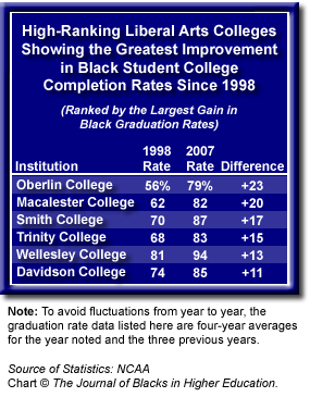In 2007, 15 of the 22 high-ranked liberal arts colleges for which JBHE has long-range data showed an improvement in black student graduation rates from their 1998 rates. At Oberlin College in Ohio, there was a huge 23 percentage point improvement in the decade from 56 percent to 79 percent. At Macalester College in Minnesota, there was a 20 percentage point gain since 1998. At Wellesley, Davidson, Trinity, and Smith, the black student graduation rate improved by 11 percentage points or more over the past eight years.