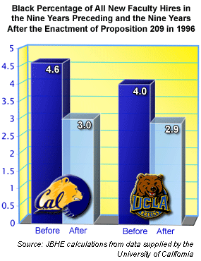 The impact of Proposition 209 is even greater at the two most prestigious campuses of the University of California system. From 1987 to 1996, there were 27 new black faculty appointments at Berkeley. They made up 4.6 percent of the 593 new appointments made in that period. In the nine years since Proposition 209, there have been 18 new black faculty appointments. They made up 3 percent of the 599 new faculty hires.