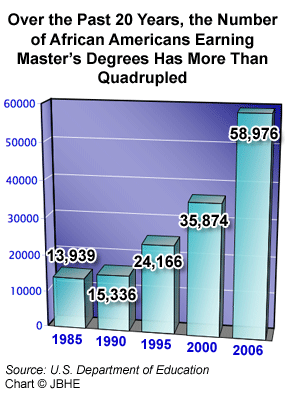 In the 2005-06 academic year blacks earned 58,976 master’s degrees at U.S. colleges and universities. The number of blacks earning a master’s degree was up 8 percent from the previous year.