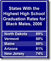 In some states black students do quite well. In North Dakota, 89 percent of all black males graduate from high school, the highest rate in the nation. In Vermont and Maine, the black male high school graduation rate is 85 percent or more. Of course, there are very few black students in these states.