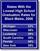 At the other end of the spectrum, Michigan has the lowest high school graduation rate for black male teenagers. There, only one third of all black males graduate from high school. The black male high school graduation rate is below 40 percent in Wisconsin, Louisiana, South Carolina, Florida, and New York.