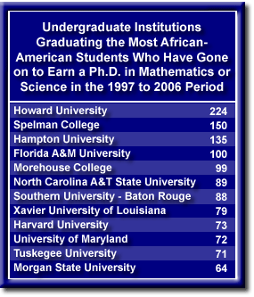 The eight colleges and universities that produced the most African-American graduates who went on to earn Ph.D.s. in mathematics or science in the 1997 to 2006 period are all historically black colleges and universities. Harvard University ranked ninth and the University of Maryland was tenth.
