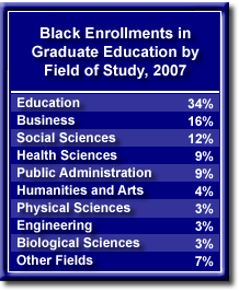 Of the 170,167 African Americans who are enrolled in graduate school, 34 percent are enrolled in programs in the field of education. For whites, 29 percent of all graduate students are enrolled in education programs.