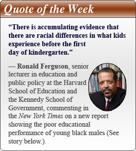A new report from the Council of the Great City Schools shows some alarming statistics on the poor educational performance of young black males. The study found that only 12 percent of black males in the fourth grade were proficient in reading compared to 38 percent of same-age white males. In mathematics, 12 percent of black males in the eighth grade were rated proficient compared to 44 percent of white males.