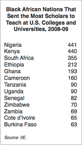 According to the Institute of International Education, during the 2008-09 academic year there were 113,494 foreign scholars teaching at colleges and universities throughout the United States. Of these, 3,800, or 3.3 percent, were from the African continent.