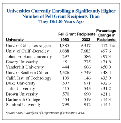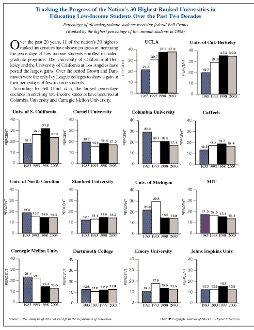 In 1976, the first year that Pell Grants were available to all low-income undergraduate students, the maximum award was $1,400. If the maximum award were indexed to the rate of inflation, today the maximum award would be $4,575, about 13 percent higher than the current level. But it must be remembered that the cost of a college education has climbed at a rate far exceeding the nation's rate of inflation. Therefore Pell Grants fall far short of keeping pace with the cost of going to college for low-income students. The College Board calculates that a Pell Grant covered 35 percent of the total cost of attending a four-year public college or university in 1980. Today the Pell Grant covers only 23 percent of the total cost of an education at a four-year state college or university. According to a JBHE analysis of data obtained from the U.S. Department of Education, over the past 20 years, only 11 of the nation's 30 highest-ranked universities have made progress in increasing the percentage of low-income students who are enrolled in their undergraduate programs. The University of California at Berkeley and the University of California at Los Angeles have recorded the biggest gains. In 1983 there were 3,888 students at Berkeley who received a Pell Grant. These low-income students made up 19.7 percent of the student body. By 2003 there were nearly 7,700 Pell Grant recipients at Berkeley. They made up 35 percent of the student body. A similar pattern prevails at