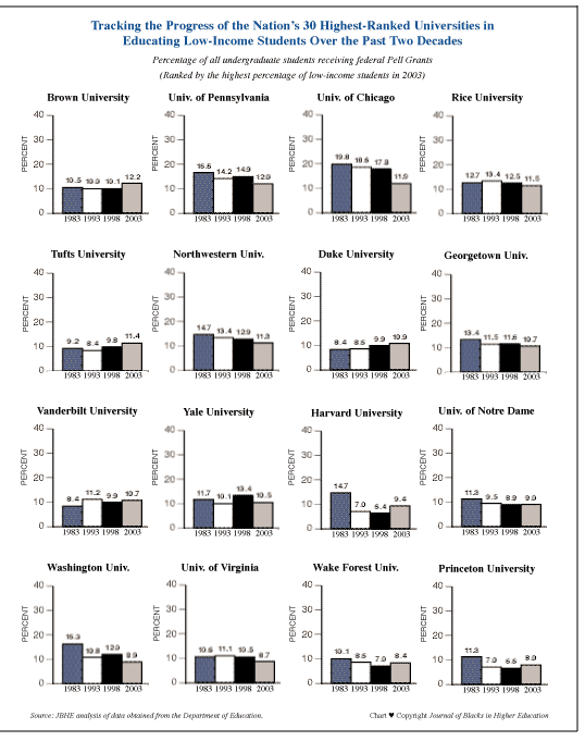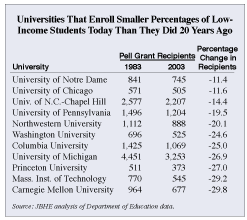 Over the 1983 to 2003 period Brown and Dartmouth were the only Ivy League colleges to post a gain in low-income students. But these gains have been slight. The percentage of low-income students at Brown and Dartmouth is less than one third the level that prevails at UCLA. Several universities have posted major declines in low-income students since 1983. At Columbia University in New York City, the number of Pell Grant recipients dropped from 1,425 in 1983 to 1,069 in 2003. This is a decline of nearly 25 percent. At Carnegie Mellon University, Pell Grant recipients dropped from 964 to 677, a decline of almost 30 percent. At the University of Michigan the number of Pell Grant recipients has been on a roller-coaster ride. In 1983 there were 4,451 students with Pell Grants. This jumped by nearly 40 percent to 6,219 in 1993. But over the next 10 years the number of Pell Grant recipients at the University of Michigan dropped from 6,219 to 3,253, a decline of 47.6 percent. In recent years several of the high-ranking universities including Harvard, Princeton, the University of Virginia, and the University of North Carolina have enriched their financial aid plans in an effort to attract more low-income students. The Princeton plan is the most generous in the nation. At Princeton, students from families with incomes below $50,000 now receive all their financial aid in the form of grants. There are no student loans. Princeton's extraordinarily generous financial aid plan has been in effect for four years. Yet, according to Department of Education Pell Grant data, Princeton still ranks last in the percentage of low-income students among the nation's highest-ranked universities. It appears that a commitment to educate more students from the lower socioeconomic classes of our society requires more than even the most generous financial aid program.