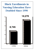 At Vanderbilt University in Nashville, black first-year enrollments doubled from 70 in 1994 to 140 in 2004. Rice University, where black enrollments have fluctuated widely in recent years, showed an increase of 82 percent in the 1994 to 2004 period. In 2005, the 70 black medical school students at Duke make up 15 percent of the student body. There are 75 black medical school students at Case Western Reserve University in Cleveland. They make up 12.3 percent of all students. Blacks are also more than 10 percent of the student body at high-ranking medical schools at Johns Hopkins University, the University of Michigan, and the University of Chicago. In 2004, the latest year for which data is available, black applications to medical school increased by 2.3 percent from a year earlier. And black first-year enrollments in medical school increased by 2.5 percent. In 1990 there were 8,745 African Americans enrolled in bachelor's degree programs in nursing in the United States. In 2004 the number of blacks in bachelor's degree programs in nursing reached a total of 16,278. Thus, black enrollments in undergraduate nursing programs have nearly doubled over the past 15 years. The progress has been even more spectacular at the graduate level. In 1990 there were 1,197 African Americans enrolled in master's degree programs in nursing in the United States. By 2004 the number of blacks in these graduate nursing programs had more than tripled to 4,096. In the fall of 2004, 350 black students enrolled at the University of Michigan. This was down from 410 black freshmen in 2003, a drop of more than 14 percent. In 2004 blacks were 5.8 percent of the first-year class. Just three years earlier in 2001, blacks were more than 9 percent of all freshmen at the University of Michigan. Now, preliminary data from the office of admissions at the university points to a strong increase of more than 20 percent in black enrollments this coming fall. In 2004 at the University of Illinois, black enrollments plummeted 32 percent. But the university reports that it expects black enrollments for this fall's entering class will be up 25.3 percent from a year ago. In the fall of 2004 only 202 black freshmen enrolled at the flagship campus of the University of Georgia in Athens. They made up only 4.5 percent of all incoming students. Preliminary data suggests that the number of black students in the first-year class at the University of Georgia this year will be up more than 73 percent from a year ago. Degree Attainments At the time of the Harlem Renaissance in the 1920s, at best 10,000 American blacks one in 1,000 were college educated. There are more than 3.8 million African Americans alive today who hold a four-year college degree.