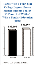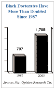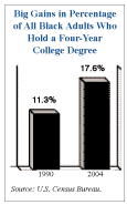 In 2004, 17.6 percent of all African Americans over the age of 25 held a four-year college degree. This figure has increased significantly from 13.8 percent in 1996 and 11.3 percent in 1990. The U.S. Department of Education reports that in the 2002-03 academic year African Americans earned 237,615 degrees in higher education. This includes degrees at all levels from two-year associate's degrees to doctorates. Blacks earned 9.1 percent of all degrees earned that year. A new report prepared by the National Opinion Research Center at the University of Chicago finds that 1,708 African Americans earned doctorates in 2003. This was an increase of 4 percent from 2002. The number of black doctorates in 2003 eclipsed the previous high annual total of 1,656 set in the year 2000. In 2003 blacks made up 6.5 percent of all doctorates awarded to American citizens. This, too, is an all-time high. At the vast majority of the nation's leading medical schools, the black graduation rate is very high. In fact, at seven of the 14 schools that supplied graduation rate data by race to JBHE, the black graduation rate was a perfect 100 percent. At four additional high-ranking medical schools, the black graduation rate is 92 percent or higher. According to the U.S. Census Bureau, the median black family income in the United States is 63 percent of the median white family income. But in 2003 blacks with a bachelor's degree had a median income of $36,694. This is 95 percent of the median income of whites with a bachelor's degree, which stood at $38,667. About 28 percent of foreign-born black men in the United States have a four-year college degree. This is very close to the educational attainment figures for native-born white men in this country. Eight years ago in 1997, only 33 percent of entering students at Alcorn State University, the historically black institution in Mississippi, went on to earn their diplomas. To increase its retention and graduation rates, Alcorn State created the College for Excellence. The mission of the school was to help freshman students adjust to college life. Students who are missing classes are given counseling. (A new program this fall will electronically monitor class attendance.) Tutoring sessions are arranged for students who are in danger of flunking out. Counselors are provided to assist students in choosing a major.