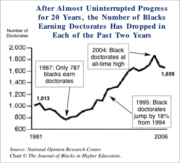 But a year later in 2005 there was a 10 percent reduction in doctoral awards for blacks. This was only the third decline in the past 20 years. Now new data released by the National Opinion Research Center at the University of Chicago shows that in 2006 the number of black doctorates has declined once again. This year the decline was slight, from 1,688 in 2005 to 1,659 in 2006. This is a drop of 1.7 percent. In 2004 blacks earned 7.1 percent of all doctorates awarded in the United States. In 2006 the percentage of all doctorates awarded to blacks dropped to 6.2 percent. Despite the setback of the past two years, the overall progress in the past two decades has been rock solid. In 1987 only 787 African Americans earned doctorates. This year’s total of 1,659 doctorates is more than double the number earned by African Americans in 1987. In 1990 the black share of all doctoral awards was 3.6 percent. That has now grown to 6.2 percent, a showing of significant progress in a relatively short period of time of 17 years. Although African Americans have made solid progress in doctoral awards, much remains to be achieved. African Americans are nearly 13 percent of the U.S. population. Therefore, black doctoral awards still amount to less than one half the level that would occur were racial parity to prevail.