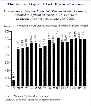 The Gender Gap in Black Ph.D. Awards As is the case in almost every measure of African-American achievement in higher education, black women have come to hold a large lead in doctoral awards. As recently as 1977 black women earned only 38.7 percent of all doctorates awarded to African Americans. By 2000 black women earned 65.7 percent of all doctorates awarded to African Americans. There have been only minor fluctuations since the beginning of the century. In 2006 black women earned 65 percent of all doctorates awarded to African Americans. Since 1990 African-American women have increased their number of Ph.D. awards from 550 to 1,079. This is an increase of 96 percent. In contrast, the number of Ph.D. awards to African-American men increased from 351 in 1990 to 580. This is a rise of 65.5 percent.