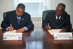 Ohio University in Athens has entered into a partnership agreement with the African University College of Communication in Accra, Ghana. Under the agreement, the two universities will participate in faculty and student exchange programs. Study aborad programs for Ohio students will be available for the study of communications and Akan, a major language used in Ghana.