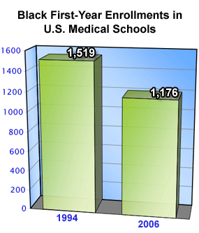 In 1994 there were 1,519 first-year black students at U.S. medical schools. By 2006 the number of first-year black students dropped to 1,176. This is a decline of nearly 23 percent. Furthermore, there is evidence that a large number of black medical school students are foreign-born Africans. As many as one half of all black students at some U.S. medical schools are foreign born or are the children of parents who were born abroad.