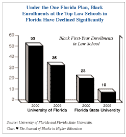 In the year 2000 Governor Jeb Bush issued an executive order banning the use of race in decisions for admission to undergraduate and graduate programs at state-operated universities in Florida. In order to soften the blow, the plan called for the top 20 percent of each class in all Florida high schools, including those schools that are predominantly black, to gain automatic admission to the state university system. Nevertheless, despite the 20 percent plan, black undergraduate enrollments at state universities have fallen significantly since the plan was put into effect. But many opponents of Bush's One Florida plan believed that the greatest negative impact on black enrollments would be at the graduate and professional school level. In the One Florida plan there is no provision for admissions to Florida's professional schools similar to the 20 percent cutoff for undergraduate college students. Since the race-sensitive admissions ban went into effect, the greatest impact has been felt at the state's two most prestigious law schools. At the University of Florida School of Law, black first-year enrollments have dropped significantly since the ban went into effect. In 2000 there were 53 black students in the entering class. By 2004 the number had dropped by more than one half to 22. This year black first-year enrollments rebounded to 35 but this is still 34 percent below the level that existed prior to the enactment of the One Florida plan. At the law school at Florida State University, there were 23 black students in the entering class in 2000. This year there are only 10 black students in the first-year class. At the University of Florida, there are no black first-year students at the business school this year. But this number can't be blamed on the One Florida plan. There were no black first-year students in 2000, the year before the ban on race-sensitive admissions went into effect. At the medical school of the University of Florida, there were 12 black first-year students in the class that enrolled in the year 2000 immediately before the ban on race-sensitive admissions went into effect. The next year the number of entering black students dropped nearly in half. This year there are 10 black students in the first year of medical school at the University of Florida. The third state where a ban on race-sensitive admissions remains in effect is Washington. Here, in 1998, voters passed Initiative 200 banning race-sensitive admissions for undergraduate and graduate programs at state-operated universities. The prohibition on affirmative action went into effect in 1999. But unlike California and Florida, the percentage of blacks in the state population is very small and there were very few blacks enrolled in graduate professional schools even before the ban was enacted. For example, in 1998 there was only one black first-year student at the University of Washington law school. After the ban went into effect in 2000 there also was only one black first-year student among the 158-member, first-year class at the school. At the University of Washington's medical school, an institution that is highly regarded in the academic community, the ban on affirmative action has put a damper on the number of black applicants. In 1999, 159 blacks applied to the medical school. This past year the number has dropped to 99. However, the number of black students admitted and enrolled at the school has remained relatively constant. This year there are five black first-year students making up 2.8 percent of the class. The number of blacks at the business school at the University of Washington is so small that it is impossible to determine if the ban on race-sensitive admissions has had any role in enrollment trends. Since the ban went into effect the number of black first-year students has ranged from zero to three. Similar numbers of blacks were enrolled at the business school prior to the ban.