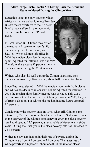 In one case the Justice Department sued Southern Illinois University to force it to eliminate fellowship programs that were established to benefit blacks and other minorities. To avoid the litigation, the university caved in and eliminated the programs. • The president proposed to eliminate funds from student outreach programs such as Upward Bound, Gear Up, and Talent Search. These are programs that seek to encourage disadvantaged students to enroll in higher education. The president also tried to eliminate these programs last year but Congress rejected the cuts. • Under the president’s new 2007 budget proposal, funding for black colleges and universities would be frozen at 2006 levels. • The president’s budget calls for the elimination of the Thurgood Marshall Legal Educational Opportunity Program, a tutoring program for minority and low-income students who aspire to go to law school. • The president has gutted many adult education programs at community colleges which many African Americans used for job-related retraining. • New regulations governing welfare recipients issued by the Bush administration earlier this summer would sharply reduce the number of low-income people who are able to enroll in high education. The new rules require states to move more quickly to transfer people from the welfare rolls to payrolls. Previously, welfare recipients could still qualify for benefits if they were enrolled in higher education instead of working. But under the new regulations, welfare recipients will be allowed to continue to receive benefits for one year only if they are enrolled in vocational training but not in undergraduate or graduate degree programs. Associ-ate degree programs at community colleges would be permitted but only if the student were enrolled in a program that trained him or her for a specific vocation. • Overall spending for the Department of Education was reduced by 5.5 percent for 2007. Department of Education spending will be down $3.1 billion in 2007. Some 42 programs would be eliminated including a program to encourage drug-free schools. The delegates attending the NAACP convention were mostly polite to the president and many of them even laughed at his jokes. But the president’s record on black higher education is no joke. It is a tragedy. |