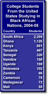 Among black African nations, South Africa was the most popular destination. In 2004-05, 2,304 American students studied in South Africa. This was up by 15 percent from a year earlier. In the 1994-95 academic year, only 86 Americans were enrolled at South African universities. Kenya, Ghana, Tanzania, Senegal, Botswana, Namibia, and Uganda were the only other black African nations hosting more than 100 American college students.