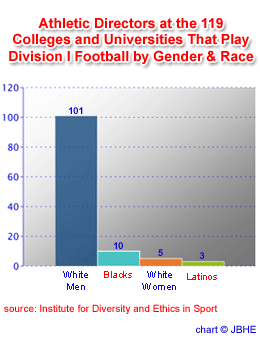 A new report from the Institute for Diversity and Ethics in Sport at the University of Central Florida suggests that the lack of blacks in head coaching positions is the direct result of an "old-boy" network in which the ones making the hiring decisions are primarily white men. According to the study, of the 119 colleges and universities in Division I, 112 institutions have a white president and 82 percent have a president who is a white man. Nearly 90 percent of the athletic directors at these institutions are white and 85 percent are white men.