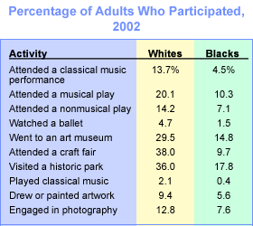 A recent survey by the National Endowment for the Arts offers participation rates for a wide range of leisure activities that are generally associated with people who have a high level of education. In all cases, whites are more likely to participate than blacks, but sometimes the differences in participation rates are far greater than the college completion rate disparities noted above. In some if not all cases, whites’ higher average income may be a factor in their higher participation rates in the activities named.