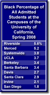 This spring 2,305 African Americans were admitted to the nine undergraduate campuses of the University of California. This is an increase of 11.3 percent from a year ago. Blacks make up 3.8 percent of all students admitted to the University of California system. Blacks are about 7 percent of the college-age population in the state.