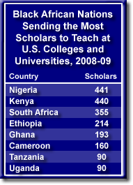 According to data from the Institute of International Education, scholars from 43 black African nations taught at U.S. colleges and universities during the 2008-09 academic year. Nigeria sent 441 scholars to teach in the U.S., more than any other black African nation. Kenya was a close second with 440. South Africa sent 355 scholars to teach at U.S. universities. But it is not known how many of these South African scholars teaching in the U.S. are white and how many are black.