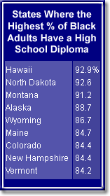 The census statistics show that more than 90 percent of all blacks in Hawaii, North Dakota, and Montana in 2000 held a high school diploma. Alaska, Wyoming, Maine, Colorado, and New Hampshire also have a high percentage of blacks who have completed high school.