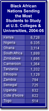 Among the black African nations, Kenya in 2004-05 sent the most students to American colleges and universities. In that period, 6,728 Kenyans were studying here.