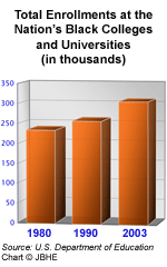 According to the Department of Education, enrollments at the nation’s historically black colleges and universities continue to climb. In 2003, the latest year for which complete data is available, there were 306,727 students enrolled at 99 black colleges and universities in the United States. This is up from total enrollments of 257,152 students in 1990, an increase of 19 percent. This comes on the heels of a 10 percent enrollment increase during the 1980s.