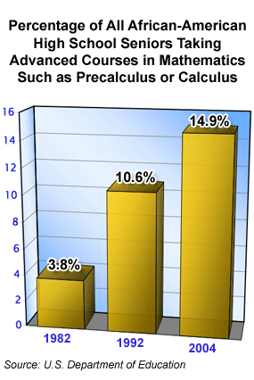 A new report from the U.S. Department of Education shows that there has been substantial progress in the number of black students who are taking challenging mathematics courses in high school. The report, Trends Among High School Seniors, 1972-2004, shows that in 1982 only 3.8 percent of black high school seniors were taking an advanced mathematics course such as precalculus or calculus. By 2004 nearly 15 percent of black high school seniors were taking advanced mathematics. Thus, over the period, the percentage of black seniors taking advanced mathematics nearly quadrupled.