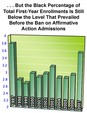 For the first time, in 1998, admissions to undergraduate campuses of the University of California were conducted under a policy where race could not be considered as a positive factor by admissions officials. As a result, black enrollments declined. Since that time, the number of black first-year students systemwide has nearly doubled. But blacks are only 3.6 percent of all first-year students, a level that is still below the level that prevailed prior to the ban.