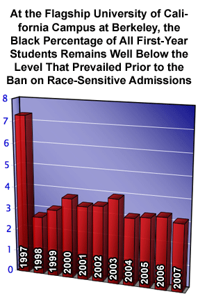 At some campuses of the University of California system, the black percentage of all first-year students has shown a severe decline. It appears that right-wing groups who are determined to push blacks down into second-tier institutions have succeeded. In 1977, prior to the ban on affirmative action at the University of California at Berkeley, blacks made up 7.3 percent of the entering class. This coming fall, blacks are only 3.1 percent of all entering students.