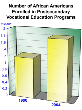 In 1990 African Americans were 11.6 percent of all students enrolled in postsecondary vocational education programs. Since 1990 the number of black students enrolled in these vocational programs has increased by about 50 percent.