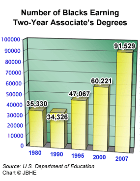 But there is some good news. In 2007 more than 90,000 African Americans were awarded two-year degrees at the nation’s community colleges. This is up more than 50 percent from the year 2000.