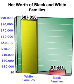 Family assets such as stocks, bonds, money in the bank, and real estate produce interest, dividend, or rental income which are commonly used to offset or pay college costs. More important, these assets can be sold or borrowed against to provide funds for college expenses. In measuring family wealth, blacks come up even shorter than they do in comparison to family income. The latest data from the U.S. Census Bureau shows a median net worth for black families of $5,446. For white families the median net worth is more than 15 times larger: $87,056.