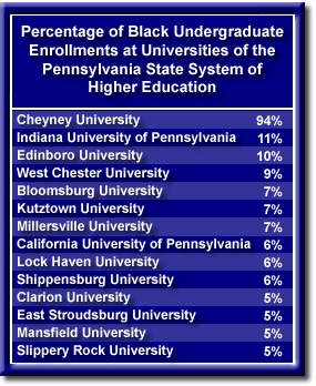 Almost all of the 14 state universities are in rural areas far from black population centers. As a result, most have very low percentages of black students. The one exception is Cheyney University, a historically black institution.