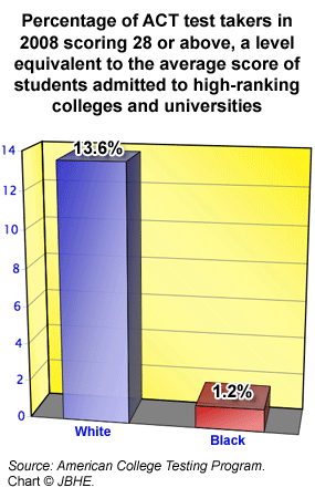 For students who take the ACT college admission test, the nation’s highest-ranked colleges and universities aim to recruit students who score 28 or above. Nationwide in 2008, only 2,172 black students scored 28 or above on the ACT test. They made up only 1.2 percent of all black ACT test takers. In contrast, 121,408 white students scored 28 or above on the ACT test this year. They made up 13.6 percent of all white ACT test takers. Thus, whites were more than 11 times as likely as blacks to score at a level equivalent to the mean score of students admitted to the nation’s most prestigious colleges and universities.