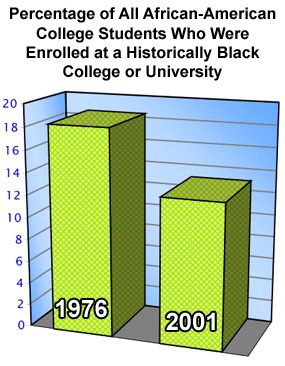 Overall enrollments at the nation’s historically black colleges and universities have increased in recent years. But an analysis of Department of Education data by the Associated Press finds that there have been declines in enrollments at 26 of the 87 black colleges surveyed. The largest decline was at Talladega College where enrollments were down 54 percent from 1995 to 2004. Fisk University and Tuskegee University, two of the most prestigious black colleges, also had drops in enrollments. The study found that in 1976, 18.4 percent of all African-American students were enrolled at a historically black college. In 2001 that figure had dropped to 12.9 percent.