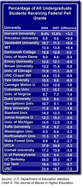 But data obtained by JBHE from the U.S. Department of Education on recipients of Pell Grants at these high-ranking universities show that most of these educational institutions have not been successful in increasing the socioeconomic diversity of their student bodies. (Pell Grants are reserved for students who come from families with low incomes.) In fact, in the vast majority of cases, there is a smaller percentage of low-income students at these institutions than before the new financial aid programs were put into effect.