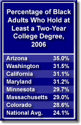 There are wide disparities in educational attainment rates by state. The Census figures show that in Arizona, California, Washington State, and Maryland, more than 30 percent of black adults hold at least a two-year college degree.