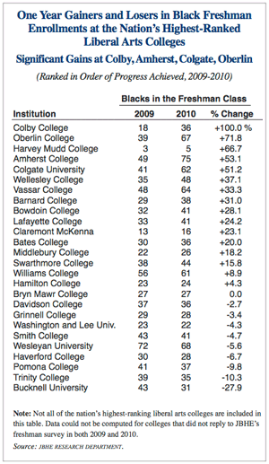 High-Ranking Liberal Arts Colleges That Made the Most Progress in Increasing Black Freshman Enrollments in 2010