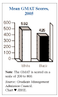 Students seeking admission to graduate schools of business are in most cases required to take the Graduate Management Admission Test. In 2005, 8,448 African Americans took the GMAT test. They made up 7.9 percent of all GMAT test takers that year. The mean black score on the GMAT was 425. (The test is scored on the familiar 200 to 800 scale used for each section of the SAT test.) For whites, the mean GMAT score was 532. This is 107 points or 18 percent higher than the mean score for blacks. The racial scoring gap on the GMAT test has increased in recent years. In 2003 the scoring gap was 101 points. The next year the gap increased to 104 points. And now the gap has increased further to 107 points.