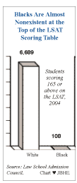 In 1998 the mean score of white students taking the Law School Admission Test (LSAT) was 151.96. (The LSAT is graded on a scoring scale of 120 to 180.) The mean score for black students taking the test that year was 141.80, about 17 percent lower than the mean score of whites. The latest data shows a slight improvement for both blacks and whites, but there was no progress in closing the racial scoring gap. In 2004 the mean score for whites on the LSAT was 152.47. For blacks, the mean score was 142.43. The 10 point, or 17 percent, scoring gap has remained constant throughout the period with only very minor fluctuations. Students seeking admission to the nation's highest-ranked law schools such as Yale, Harvard, and Stanford have a mean LSAT score of about 170. Data obtained by JBHE from the Law School Admission Council shows that very few blacks nationwide score at this level.