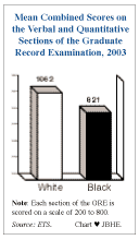 In 2004, 10,370 blacks took the LSAT examination. Only 29 blacks, or 0.3 percent of all LSAT test takers, scored 170 or above. In contrast, more than 1,900 white test takers scored 170 or above on the LSAT. They made up 3.1 percent of all white test takers. Thus whites were more than 10 times as likely as blacks to score 170 or above on the LSAT. There were 66 times as many whites as blacks who scored 170 or above on the test. Even if we drop the scoring level to 165, a level equal to the mean score of students enrolling at law schools ranked in the top 10 nationwide but not at the very top, we still find very few blacks. There were 108 blacks scoring 165 or better on the LSAT in 2004. They made up 1 percent of all black test takers. For whites, there were 6,689 test takers who scored 165 or above. They made up 10.6 percent of all white students who took the LSAT examination. The nation's top law schools could fill their classes exclusively with students who scored 165 or above on the LSAT. But if they were to do so, these law schools would have almost no black students. The Widening Racial Scoring Gap on the Graduate Record Examination The vast majority of black graduate students do not attend professional schools of law, business, or medicine. Most black students are enrolled in graduate programs in other academic disciplines including education, natural sciences, mathematics, foreign languages, the humanities, the arts, history, psychology, and the social sciences. For these students the important test is the Graduate Record Examination (GRE). This test begins with two analytical writing sections, one where the student is given a choice of topics. The analytical writing section is scored on a scale of 0 to 6. Then there is a 30-minute verbal reasoning test and a 45-minute quantitative section. The test is given on a computer terminal and the test is adaptive, meaning that the test questions are selected based on correct or incorrect responses to previous questions. These two sections are scored on the familiar 200 to 800 scale used for the SAT test. Each year about 300,000 college students seeking admission to graduate programs in fields such as education, the humanities, the natural sciences, and the social sciences sit for the GRE. In 2003, the latest year for which there is complete data available, 27,267 blacks took the GRE test. Therefore, blacks made up 8.8 percent of all students who took the GRE.