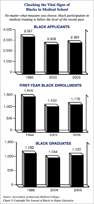 In 1996 there were 3,527 blacks who applied for admission for medical training, the highest level in history. From 1996 to 2003 black applicants to medical school dropped by more than 20 percent to 2,808. Since that time, there has been a slight increase in black applications to medical school of 5.4 percent. Yet black applications to medical school remain far below the level that prevailed a decade ago. In 1994 there were 1,519 first-year black students in medical school. By 2003 the number of new black students in medical school dropped to 1,100. In 2006 there was a slight improvement to 1,176 black students entering training for careers in medicine. But once again, this total is far below the level that prevailed in the mid-1990s. The number of blacks who earned their medical degrees reached an all-time high of 1,192 in 1998. By 2004 the number of blacks who were awarded a medical degree dropped by 13 percent, to 1,034. In 2006 there were 1,122 black medical school graduates, an improvement over 2004 but still below the all-time high. In 2006 there were 46 U.S. medical schools that graduated at least 10 black doctors. There were 65 black graduates at the Howard University School of Medicine in 2006, the most black graduates of any U.S. school of medicine. Meharry Medical College was second with 51 black graduates. Morehouse College of Medicine ranked sixth with 25 black medical graduates. Among the predominantly white medical schools, Temple University led the way with 29 black graduates in 2006. The medical schools at Wayne State University, the University of Michigan, Louisiana State University, the University of Medicine and Dentistry of New Jersey, Indiana University, Ohio State University, and the University of Illinois all had at least 20 black graduates. Among the 10 highest-ranked medical schools Johns Hopkins University, the University of California at San Francisco, Washington University, Stanford University, and the University of Washington all had fewer than 10 black graduates. Serious Implications of the Decline in the Number of Blacks Enrolling in Medical School In view of the historical underrepresentation of blacks in the field of medicine, any significant decrease in the number of blacks applying to, enrolling in, and graduating from medical school is profoundly troublesome. Given the pressing need for more black practitioners, the recent trends in medical school participation by blacks must be seen as a major crisis. Why has there been such a sharp decline in black applicants, enrollments, and graduates at U.S. medical schools? There are a number of reasons. Many college students — black as well as white — appear to have chosen to leave school after college in order to explore employment opportunities in law, business, and the high-tech sector. Since the introduction of the burdens of managed care in the United States, medicine is no longer viewed as a high-paying profession. Medicine is perceived as a heavily regulated and often frustrating career. The huge rise in malpractice insurance costs is undoubtedly prompting many black as well as white students to forgo careers in medicine. An important reason for the decline in black medical school enrollments is the prohibition of race-sensitive admissions at state-operated medical schools in states such as California, Florida, Michigan, and Washington. The threat of litigation or the prospect of public referendum prohibiting race-sensitive admissions at other state-operated medical schools is probably having a dampening effect on black admissions at other medical schools across the country. |