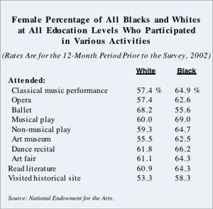 Women of all races are more likely than men to attend cultural events such as the ballet or a performance of a symphony orchestra. But gender differences are far more pronounced among African Americans than for whites. Clearly, this is because nearly two thirds of all blacks who now earn bachelor’s degrees are women. And, as stated before, college graduates are far more likely to attend these types of events than are people with a lower level of education.