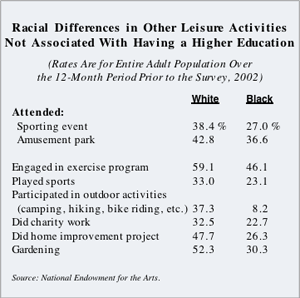 The role of money in attending or participating in cultural events can be seen in data for other leisure activities not generally associated exclusively with people who have a higher education. For example, whites are more likely than blacks to attend a sporting event or an amusement park. Whites are also more likely to garden and do home improvement projects. Money is undoubtedly the major reason for these racial differences.
