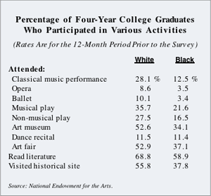 | The Black-White Divide in Cultural Pursuits Blacks are generally less likely than whites to attend or participate in cultural activities such as the theater, opera, art, or ballet. The higher education gap between the races explains some of the differences. But even among blacks and whites with a college education, a significant cultural gap exists.